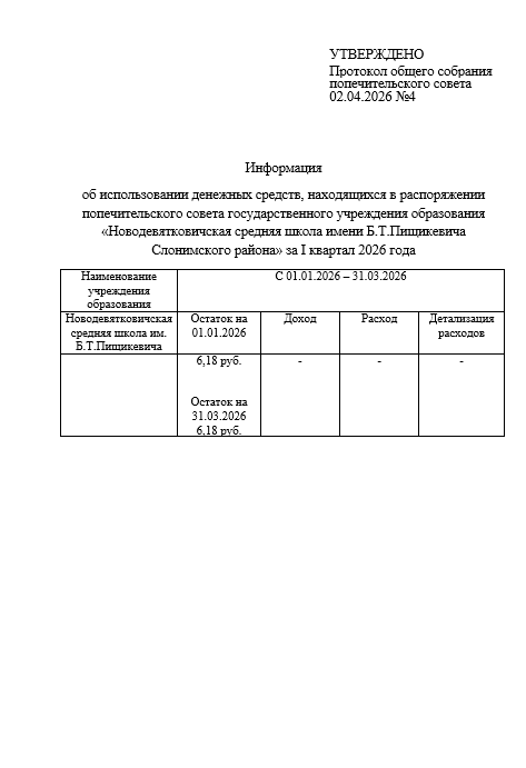 - Отчет об использовании денежных средств находящихся в распоряжении попечительского совета государственного учреждения образования «Новодевятковичская средняя школа имени Б.Т.Пищикевича Слонимского района» за I квартал 2026 года