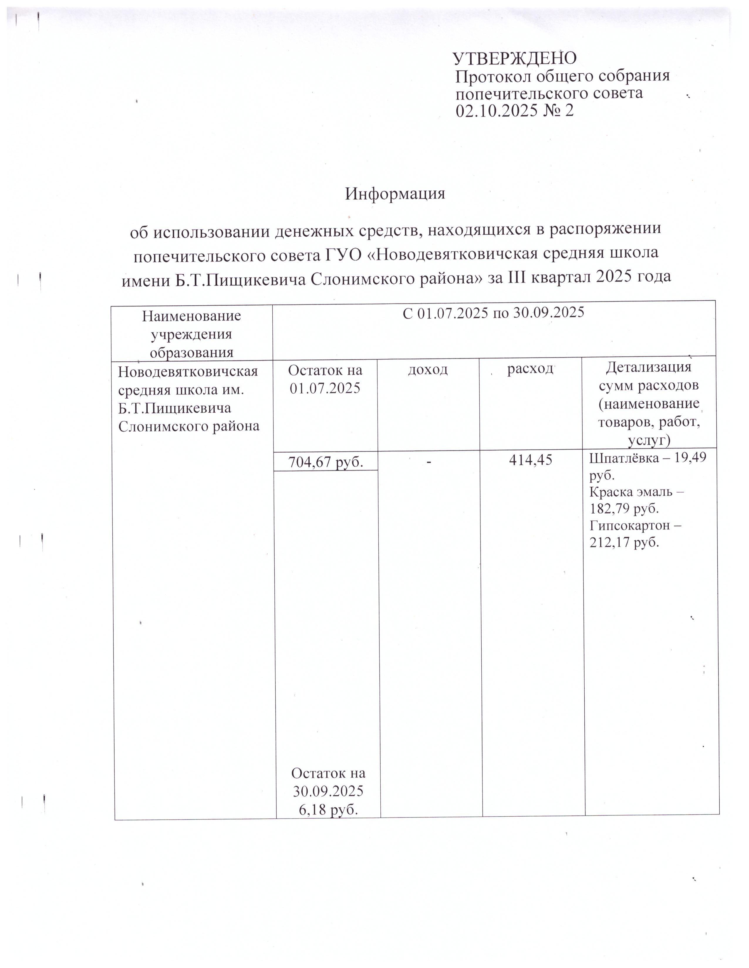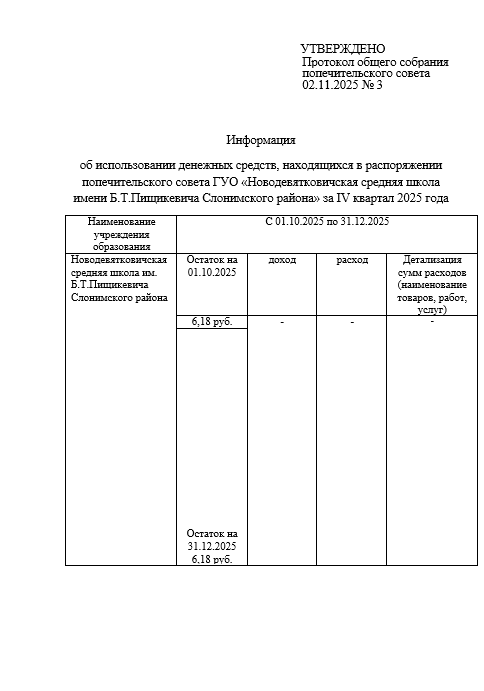 - Отчет об использовании денежных средств находящихся в распоряжении попечительского совета государственного учреждения образования «Новодевятковичская средняя школа имени Б.Т.Пищикевича Слонимского района» за III квартал 2025 года
