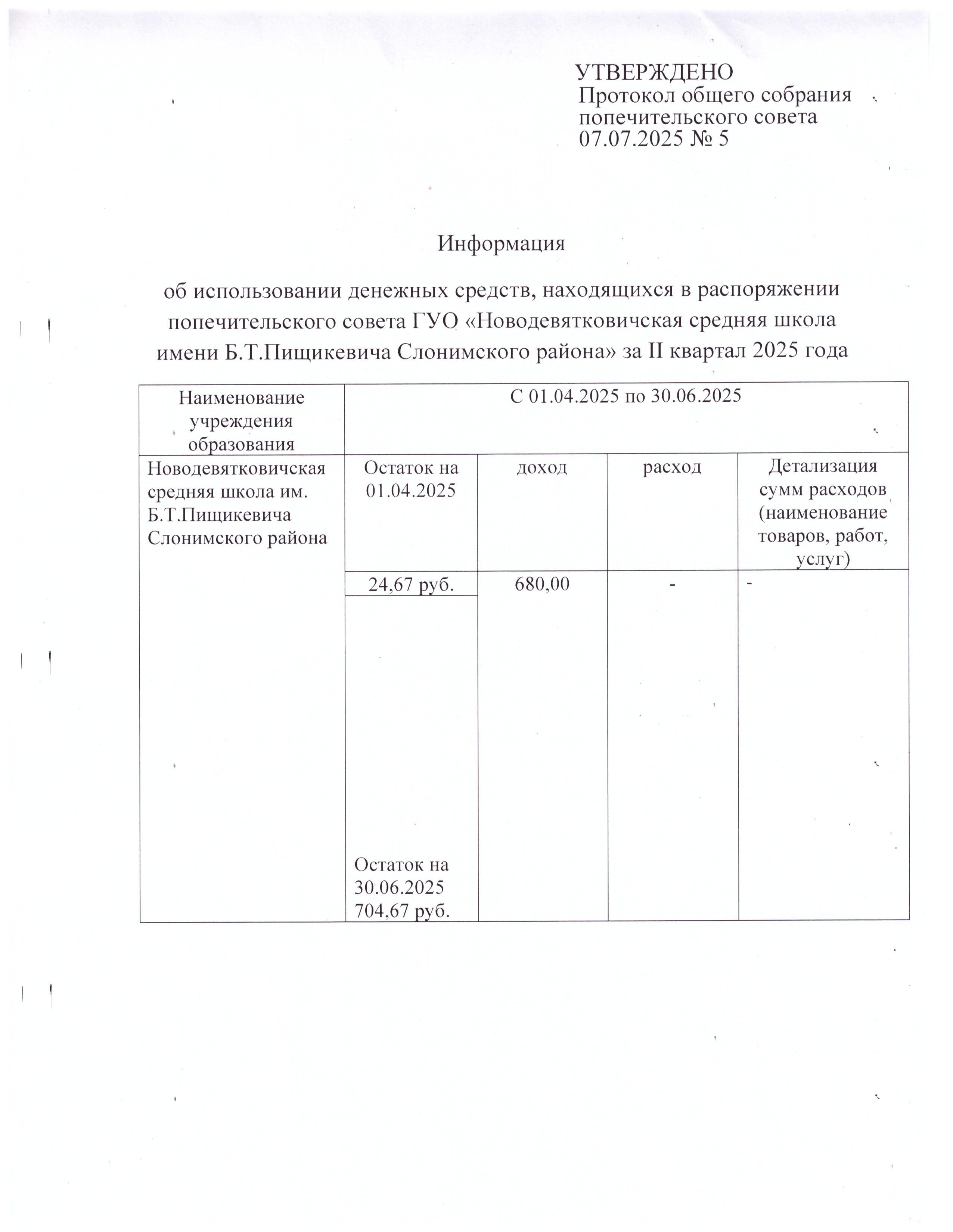 - Отчет об использовании денежных средств находящихся в распоряжении попечительского совета государственного учреждения образования «Новодевятковичская средняя школа имени Б.Т.Пищикевича Слонимского района» за II квартал 2025 года