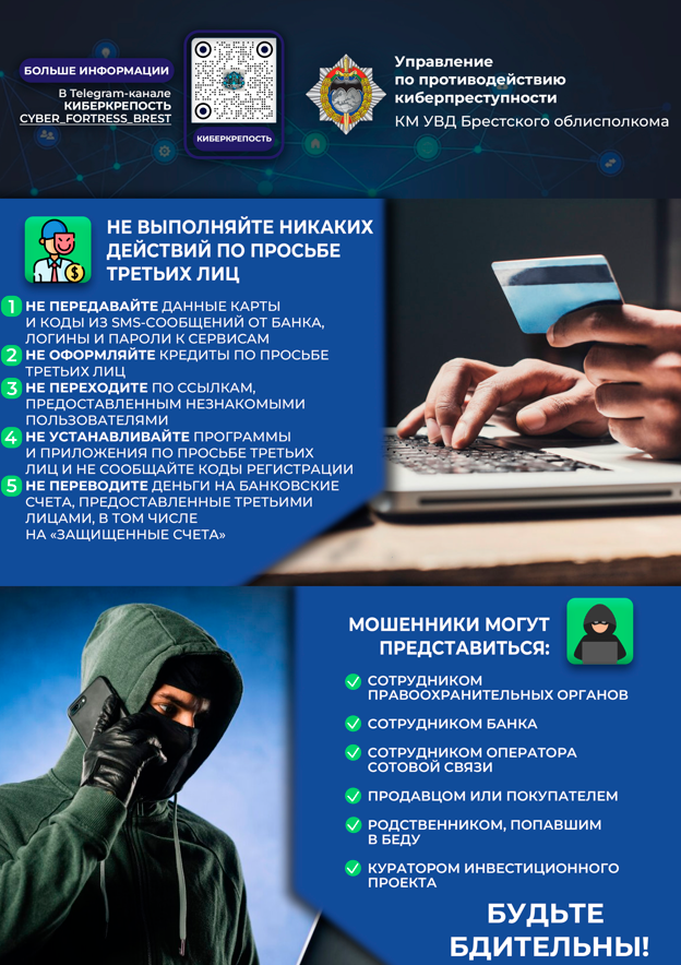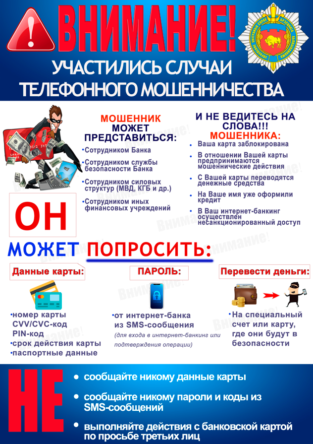 По информации пресс-службы Министерства внутренних дел Республики Беларусь в 2020 году зафиксировано 25,5 тысяч преступлений в сфере высоких технологий. Из них 23,5 тысячи – хищение денег с использованием компьютерной техники. Очень часто злоумышленники звонят в мессенджерах (приложения для переписки) якобы из банка и под разными предлогами узнают реквизиты, пин-код, трехзначный код на оборотной стороне карты.