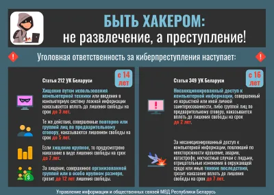 Хищение имущества путем изменения информации, обрабатываемой в компьютерной системе, хранящейся на машинных носителях или передаваемой по сетям передачи данных, либо путем введения в компьютерную систему ложной информации – наказывается штрафом, или ограничением свободы на срок до трех лет, или лишением свободы на тот же срок (ст. 212 Уголовного кодекса Республики Беларусь). За совершенные преступления ребенком в возрасте до 14 лет несут ответственность их родители.