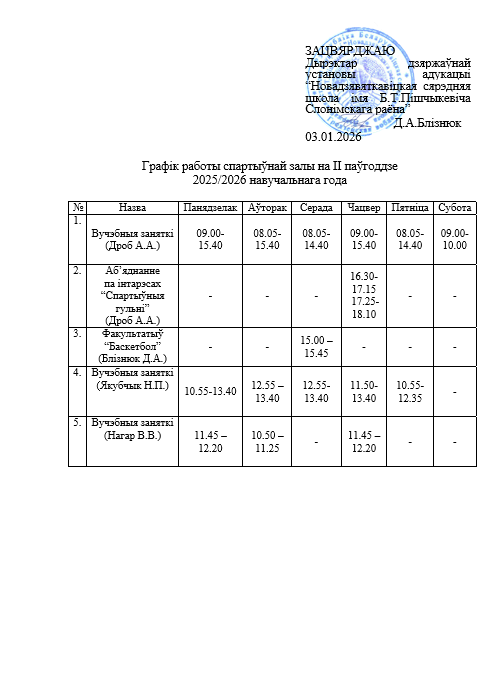 График работы спортивного зала на II полугодие 2025/2026 учебного года